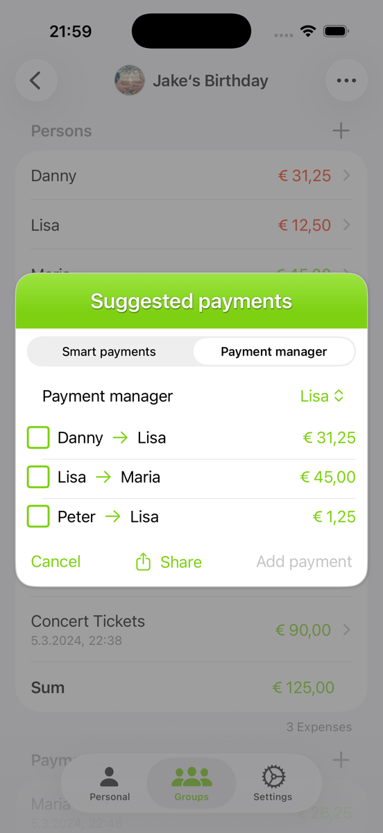 Wenn Du einen "Zahlungsmanager" festlegst, wird diese Person alle Transaktionen überwachen. Personen mit einem negativen Saldo zahlen an den Zahlungsmanager, während diejenigen mit einem positiven Saldo Zahlungen von ihm erhalten.