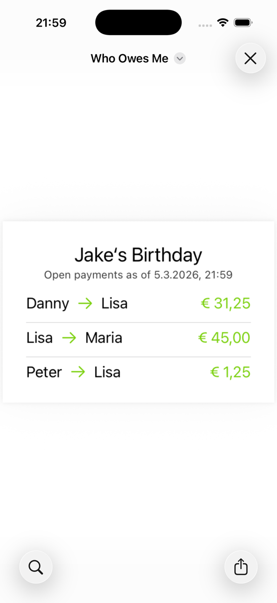 Um eine Zahlung hinzuzufügen, wähle einfach die entsprechende Zeile aus und klicke auf "Zahlung hinzufügen". Du kannst auch ein Bild teilen, das alle offenen Zahlungen anzeigt.