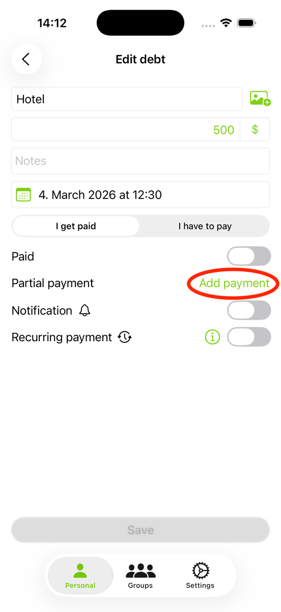 Alternatively, open the Edit view and tap Add Payment.
