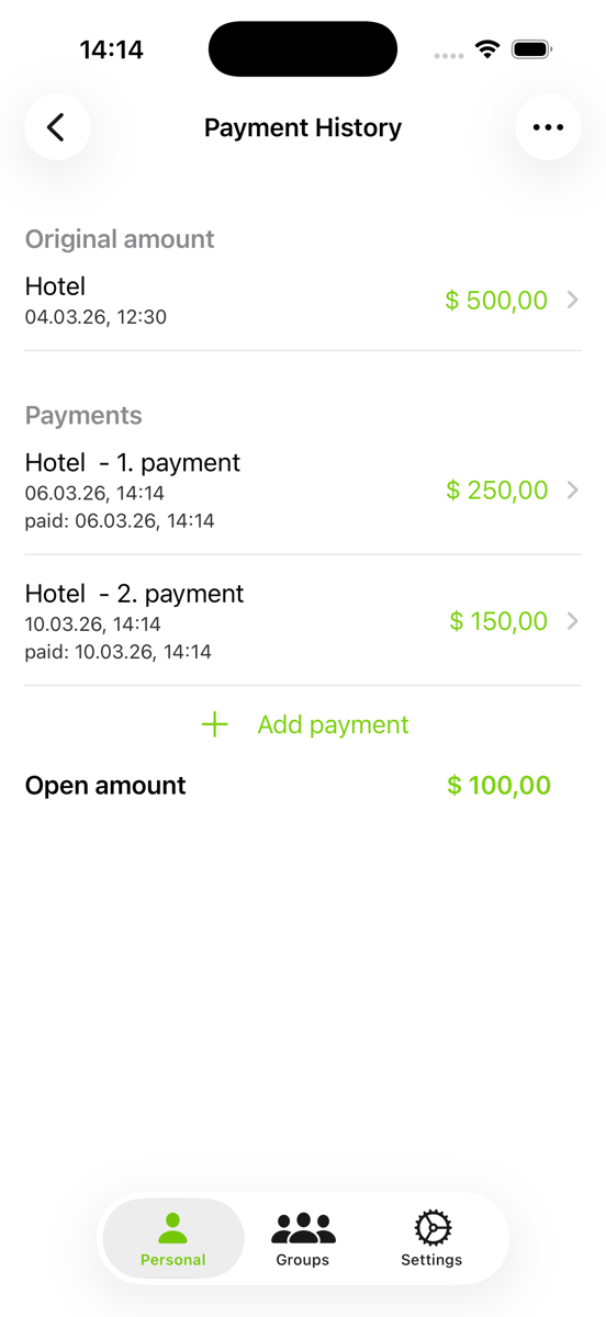 The payment will be added to the list as a paid entry, and the amount will automatically be deducted from the original debt. The original amount is shown crossed out above the remaining balance.